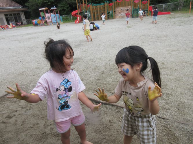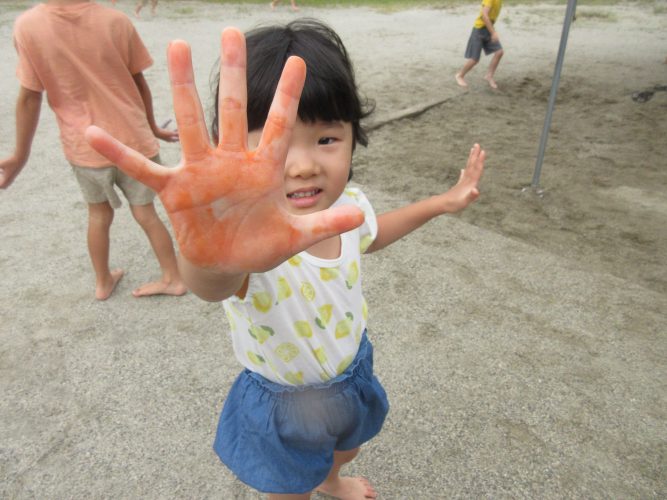 友達や先生の服や肌にペイントをやり合ったり、お揃いの色を付けて喜んだりと笑顔が絶えませんでした。