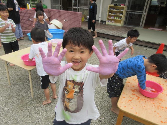 2回目という事もあり楽しみ方を知っている子ども達はスタートから大胆に手や腕、足に絵の具を付けて満足そうです。