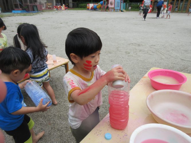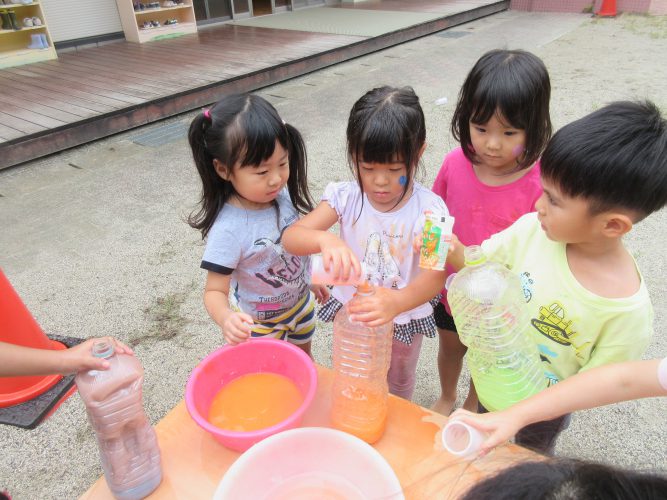 ジュース屋さんは本日も開店していましたよ。混ぜ方を工夫して綺麗な色を追求する子も出てきました。それぞれの感性を思う存分発揮していました。