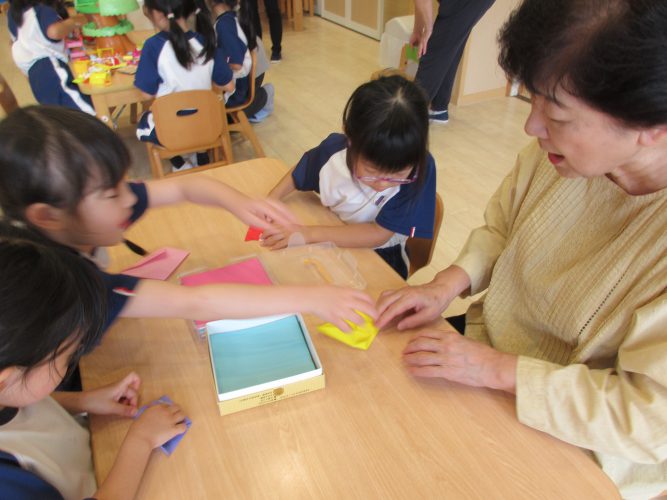 折り紙では子どもたちが折り方を伝えて一緒にバラを折ったりと楽しんでいました🎵