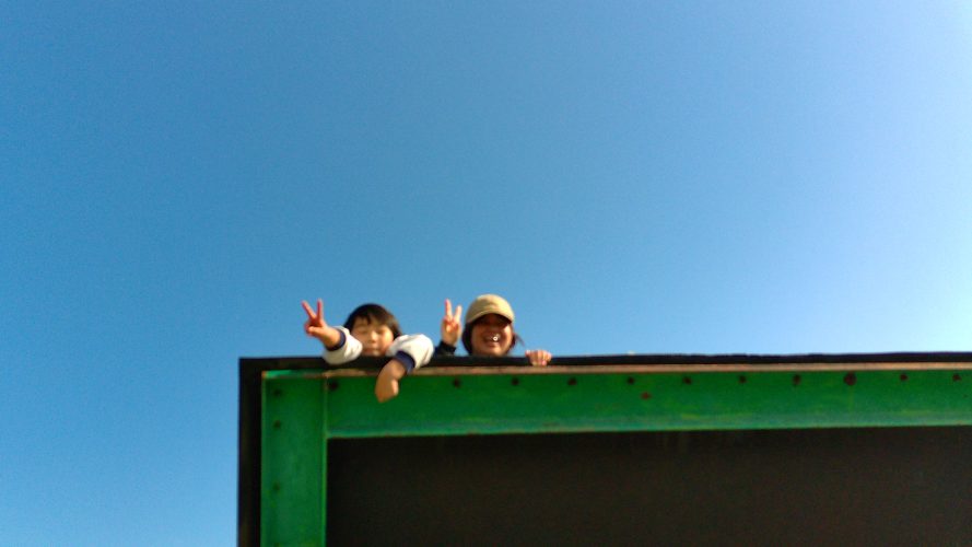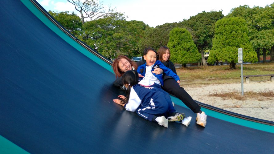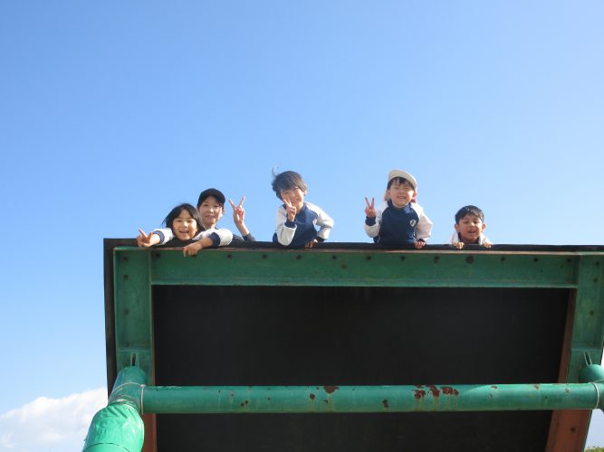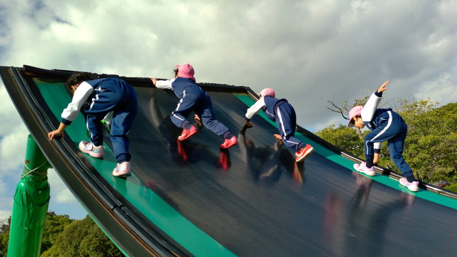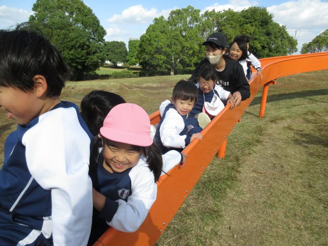 お弁当の後にも長い滑り台をみんなで滑ったり