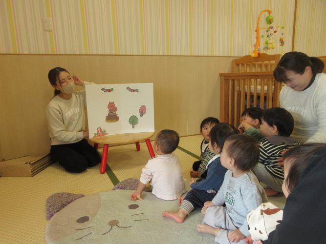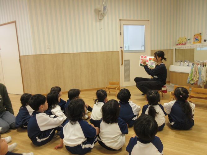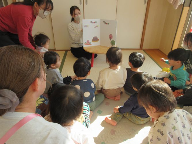 2・3歳児はスケッチブックシアター「ちょうちょを探そう」を見ました。スケッチブックの中に隠れているちょうちょを探します。「どこかな?」「お花のとこにいるー!」と見つけるのが早い子どもたち✰見つかったちょうちょが飛んでいくとばいばーいと手を振っていて可愛らしい場面がありましたよ。