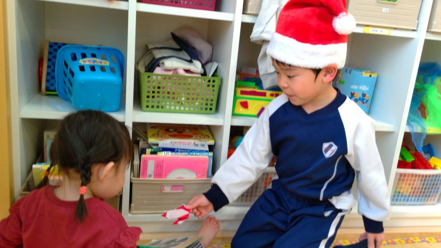 サンタクロースの折り紙を持って各クラスを回りました🎅💕