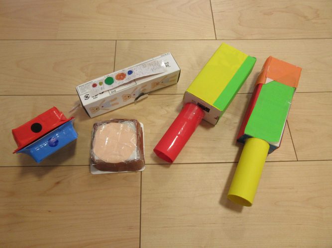 ピアニカとマラカスは空き箱を使用し、マラカスは箱の中にドングリを入れ、