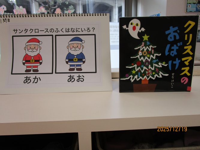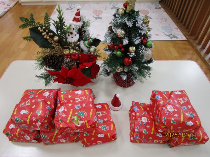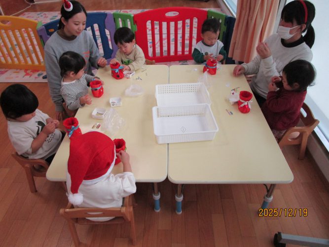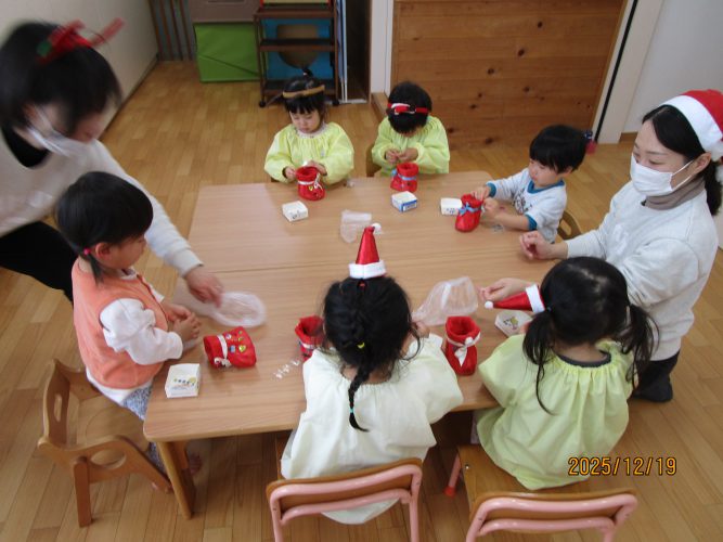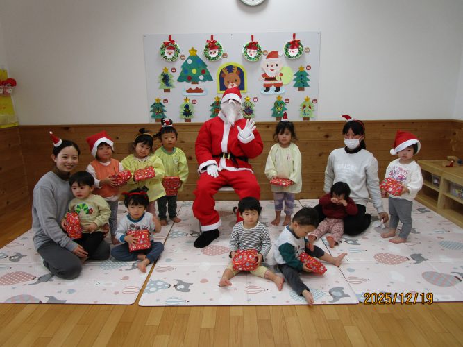 2025年12月19日 お知らせ今日、キッズステーションにあわてんぼうのサンタクロースがクリスマス前にやってきて🎅🎵ひとあし早いクリスマス会が催されました。子どもたちは帽子や飾りをひとつ身に着けて可愛いサンタさんに変身。サンタさんにまつわるクイズを楽しんだり「あわてんぼうのサンタクロース」の歌をみんなで歌ったり、ハンドベルの演奏を聴いたりしていると、大きいサンタさんがシャンシャンシャンと鈴を鳴らしてみんなの前に登場~~🎅 最初はみんなおっかなびっくり!!!でもひとりひとりサンタさんからプレゼントを貰うと小さな声ですが「ありがとー」と言っておそるおそるですがタッチもできました👍お礼に「ねえ、サンタクロースのおじいさん」の歌をプレゼントしました。来年もまたきてね~と約束をしてサンタさんは帰っていきました。そのあとミニブーツにシールを貼ってマイブーツを仕上げました。楽しいクリスマス会の時間でした🎅