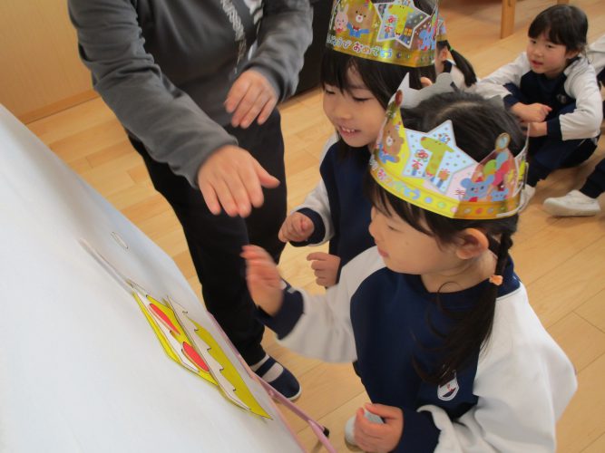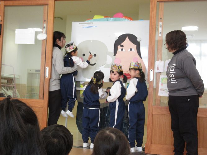 保育者からの出し物では、おせちの由来を聞いたり、福笑いをしました。