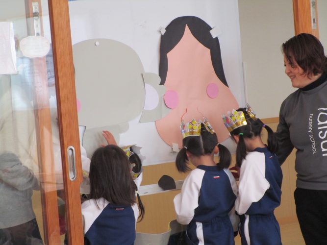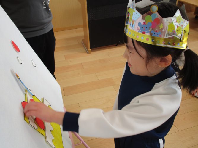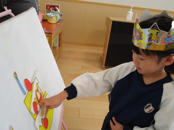 最後に、誕生日会バージョンで、ケーキの福笑いをしました。目をつむって挑戦しましたが、おいしそうな素敵なケーキに仕上がりました🎂