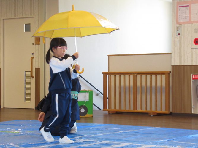 傘を差して歩く練習や踏切の渡り方も教えてもらいました。指導員さんから宿題として、小学校入学までに通学路をお家の人と歩いてみて、どんな道なのかを確かめておきましょうとお話がありました。ぜひ練習していただき、安心して通学できるといいですね🎵