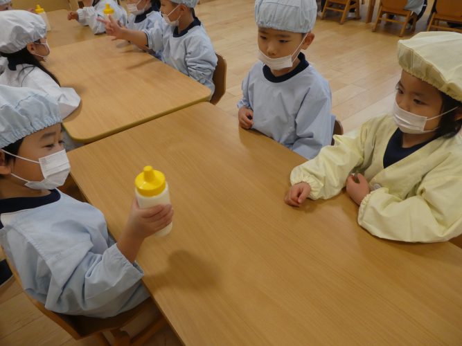 と、だんだんとバターへと変化していく様子を不思議そうに見ながらボトルを振っていました!
