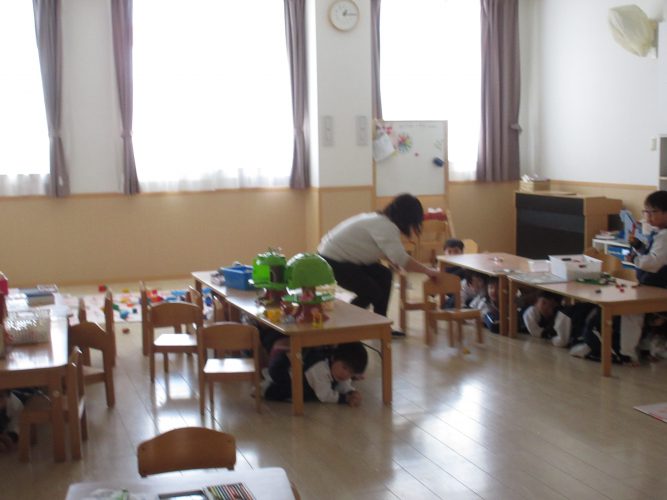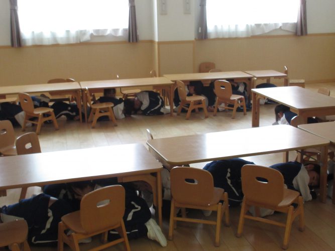 ぱんだ組🐼、らいおん組🦁のお友だちは、素早く机の下に潜る様子が見られました。