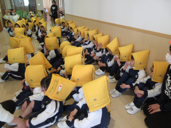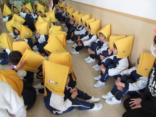 「地震がおさまりました。」との声を聞きほっと安心している様子の子どもたちです。 その後、お友だち同士で話をすることもなく静かに廊下まで避難することができました。