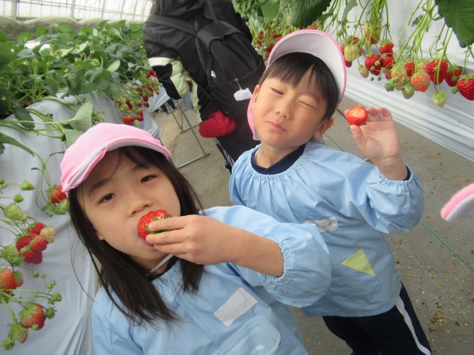 いちごがちょっぴり苦手・・・と言っていた子も食べてみると「おいしい!!」といくつか食べていました(*^-^*)自分で選んでたべるいちごは特別美味しかったようです。45分間でしたが、最後の1分まで食べ続ける子もいましたよ