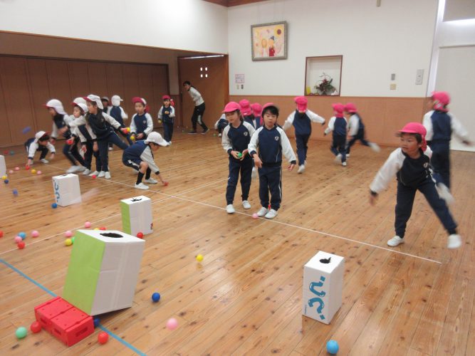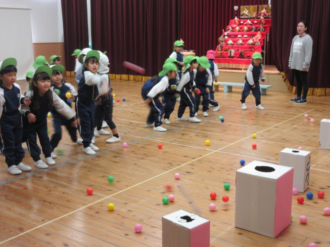 2グループに分かれ、線の上に整列!!両手にボールを持ち、お内裏様お雛様🎎BOXに合図と共にボールを投げ入れます🌟どちらのチームが多く入れれるか競争です!!