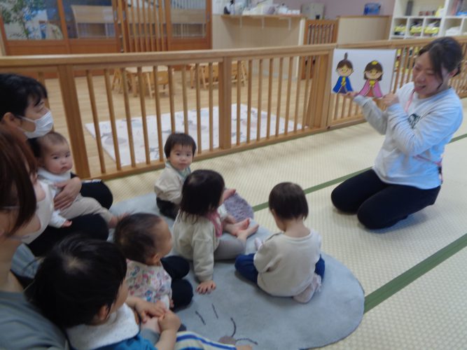 0・1歳児はひな祭りのスケッチブックシアターを見ました。玄関に飾ってあるひな人形と一緒の絵が出てきて指を差していた子どもたち😄次々とおひなさまの服が変わっていくのを楽しんでいました🎵そしてお雛様お内裏様の顔はめパネルの前で記念写真📷🌟とてもかわいい写真が撮れましたよ!