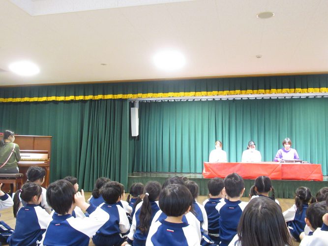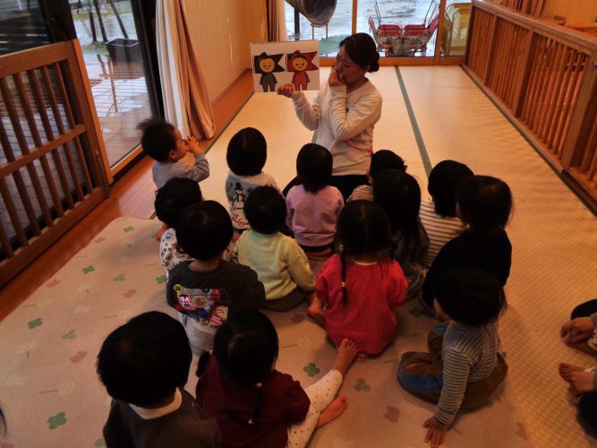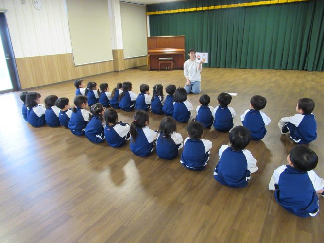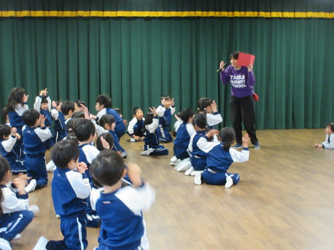 4・5歳児はホールで行いました。作品紹介、由来のお話をした後の○×クイズでは、当たるとジャンプして喜んだり、友だちとハイタッチしたりして嬉しそう♡