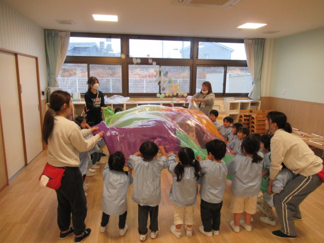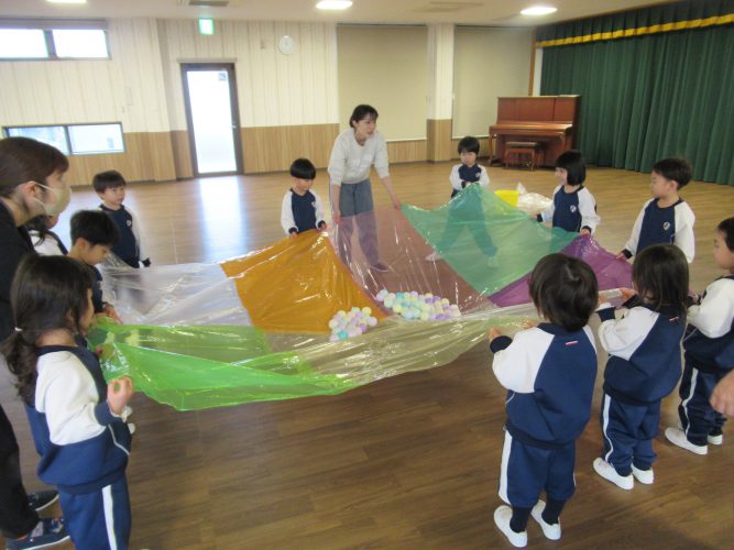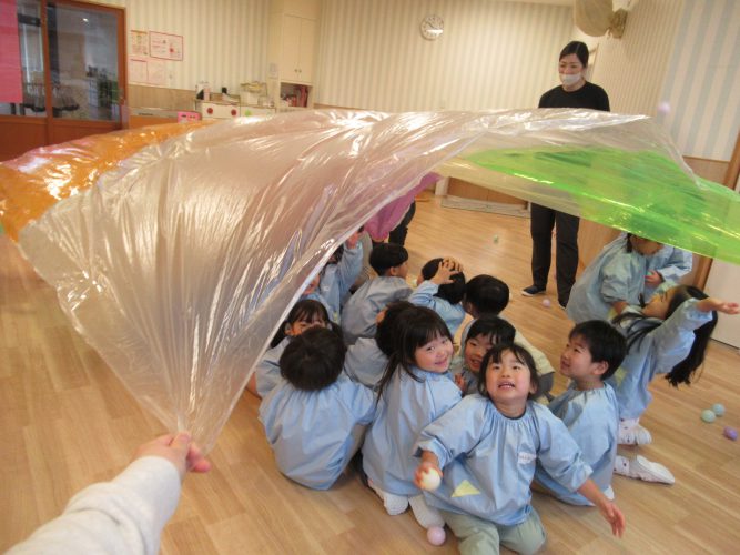 2・3歳児はひな祭りクイズと「ぽんぽんひなあられ」をして楽しみました!大きなビニールの上にひなあられに見立てたボールを乗せて、「せーの!」で跳ね上げさせると「わぁ~!」「きゃー♫」と大喜びでした!”もういっかい”コールが続きました(*^-^*)