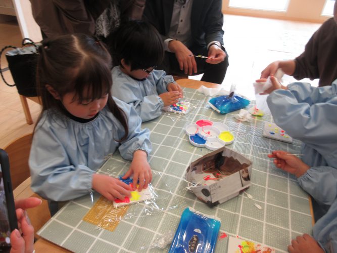赤青黄色の絵の具をコースターの上にのせて、ラップを被せ、プッシュアートをしました。