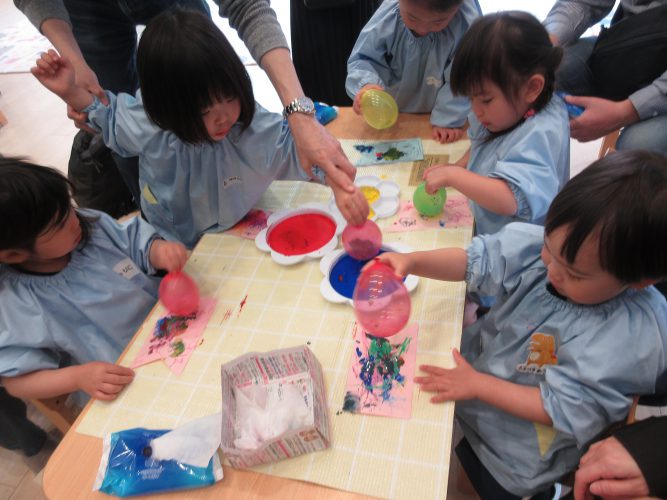 絵の具をつけた水風船で、ポンポンと押して、