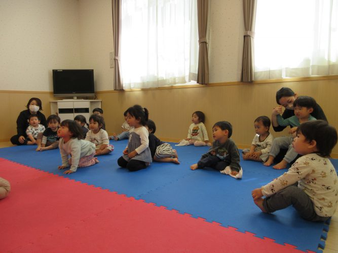 絵本が始まると夢中になり、絵本に合わせ手遊びをする姿が見られました。