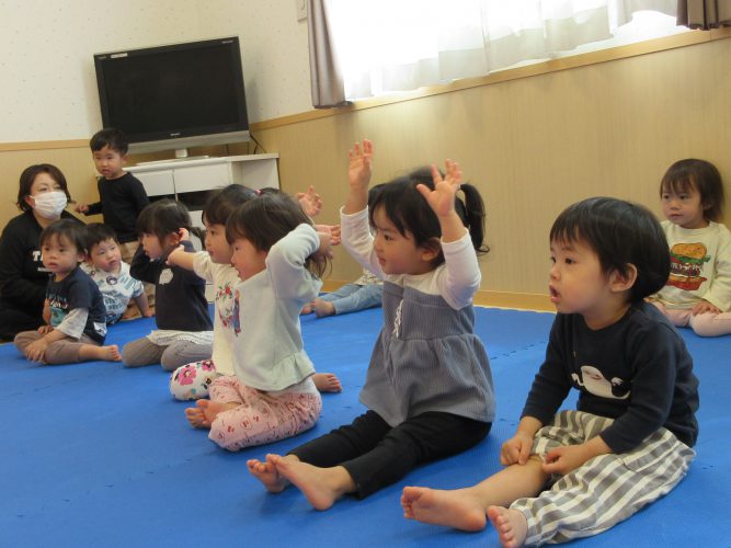 「とんとんとんひげじいさん」の手遊びが大好きな子どもたち。