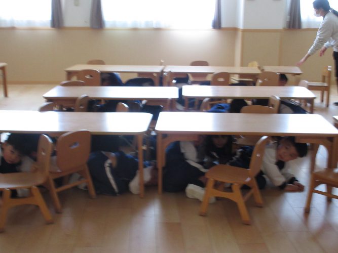 地震が起きたことを知らせると、素早く机の下に隠れダンゴムシポーズをとっている子どもたちです。