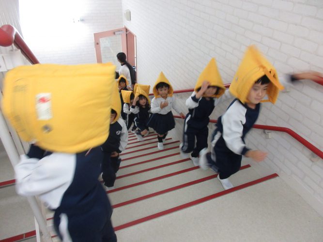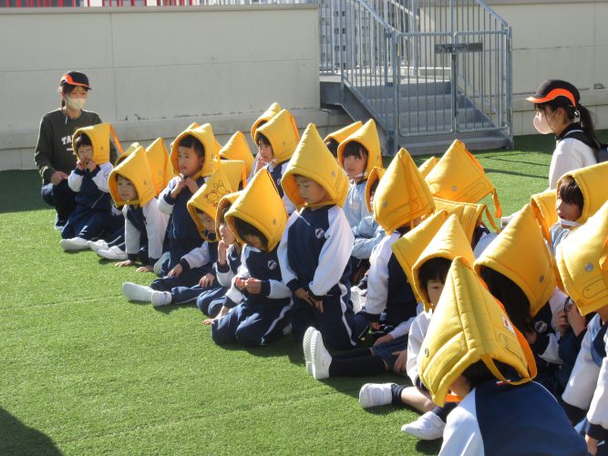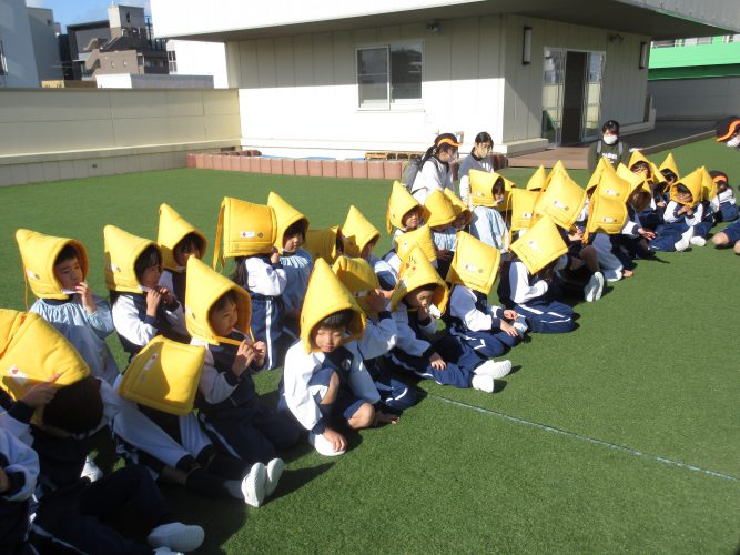 屋上に避難し、先日の青森県で起きた大地震の話しをすると、子どもたちは「知ってる!」「テレビで見た!」「頭に怪我をした人もいるんだって。」と、口々に教えてくれました。地震は、いつどこで起こるか分からないことも話し、「お・は・し・も・ち」や、防災頭巾のかぶり方を改めて伝えました。