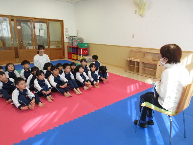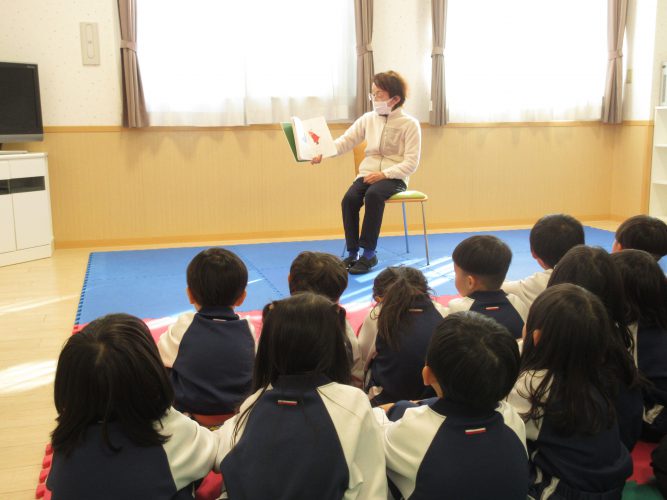 今年、最後のストーリーテリングであることを聞いた途端!らいおん組のこどもたちは、「よいお年を🎍」と米屋さんに挨拶をすると「ハッピー・ニューイヤー🌅」と言葉を返してくれました。来年も米屋さんの話が楽しみですね🍀