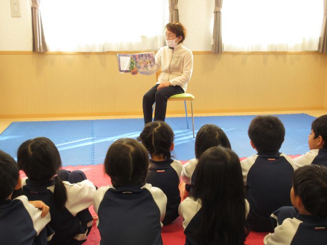 🐼みんなが知っている「ぐりとぐらのおきゃくさま🐭」の話が始まると、「知ってる!!」「クリスマス🎄の話だ!!」とワクワクしながら聞き入っていました。