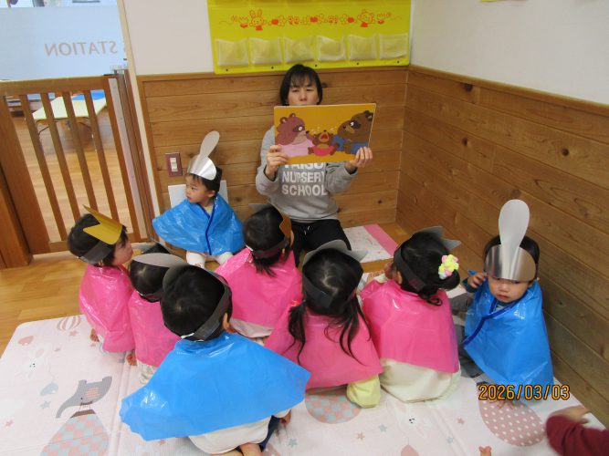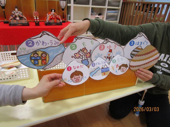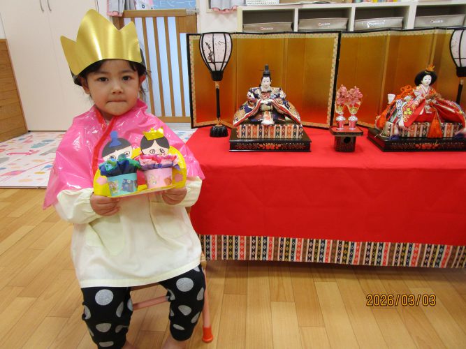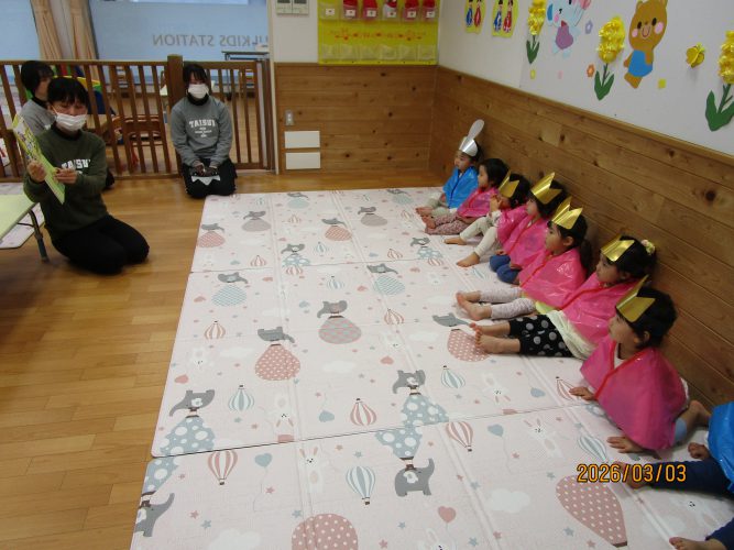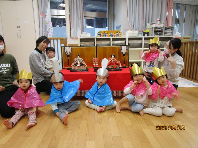 2026年3月3日 お知らせ今日は3月3日、桃の節句です。キッズステーションでもおひな祭り会を楽しみました。ケープと冠を着けて、可愛いお内裏様とおひな様に変身(^^♪ ひな祭りのお話絵本を見たり、ひな祭りに纏わる簡単な3択クイズをしました。いつも歌っている歌から答えを連想して、2歳児さんは果敢に答えていましたよ!そして、部屋のあちこちに隠れているハマグリの形を象った宝物をみんなで見つける「宝探し」を楽しみましたよ!いっぱい見つけて嬉しそうな笑顔の子どもたちでした(^_-)-☆