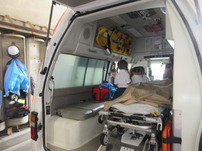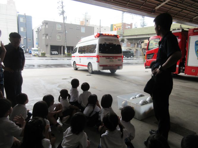 途中、救急指令が入り、救急車の出動にも立ち会いました。“助けて”といってる人の元へ今すぐ向かう様子を見守るこどもたち。「頑張ってきてね」と声を上げ応援していました。