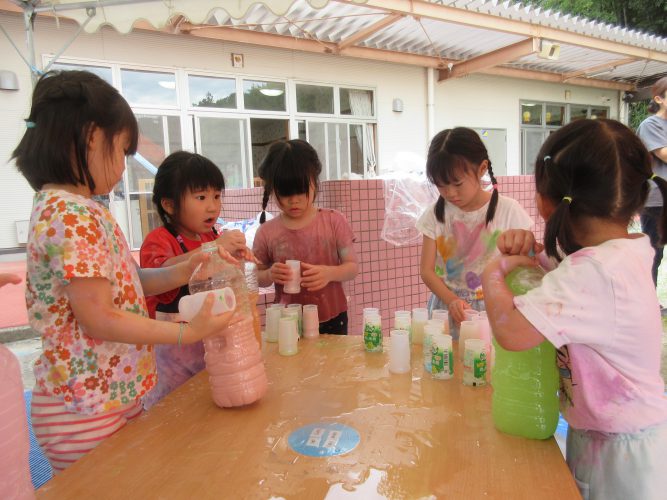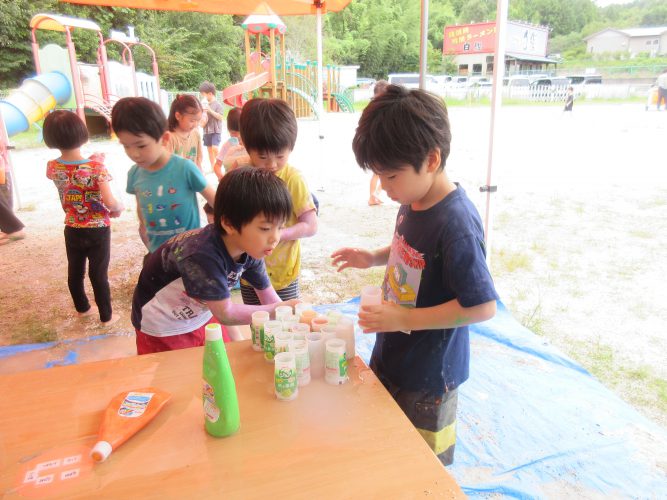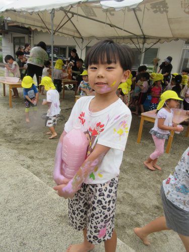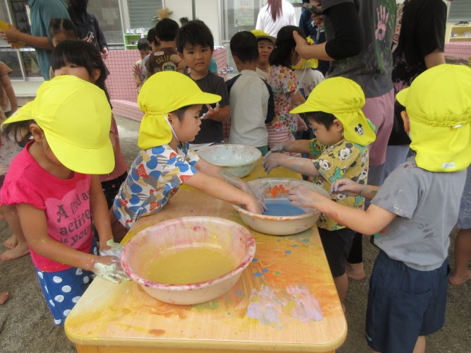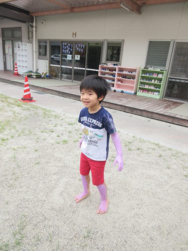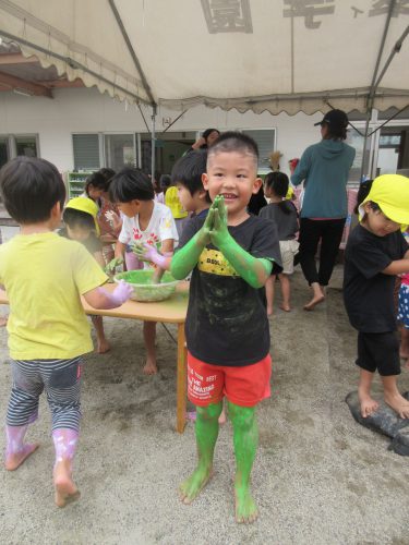 その後は外に出て、自分の身体に塗ってみたり、お友だちや先生とつけ合いっこをしたり、感触を楽しみながら色を混ぜる、容器に注いで色水遊びなどダイナミックに遊びました😊