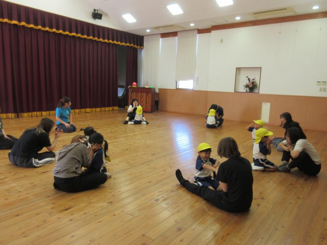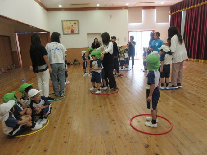 【ぱんだ組】朝の会を終え、今日はワーク活動・制作、そしてホールでリレーや椅子取りゲームのフープバージョンをみんなで楽しみました。