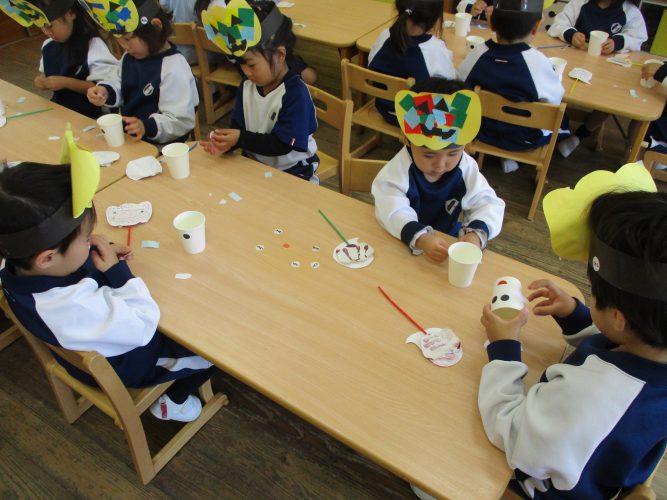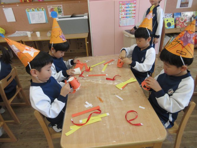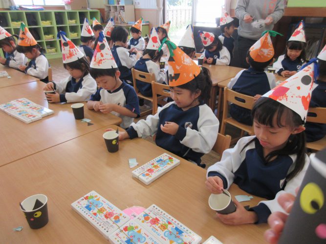 2025年10月29日 お知らせ3,4,5歳児さんがハロウィンのイベントに参加しました😊各クラスで紙コップに装飾をして、お菓子の入れ物づくりをしました。【3歳児】目や手のシールを張ってオバケのお菓子入れが完成♬【4歳児】目と耳をシールで貼ってヒゲを描き、ネコのお菓子入れを作りました!【5歳児】オレンジ色の台紙を張り、細い紙を貼り合わせてカボチャのお菓子入れの完成!