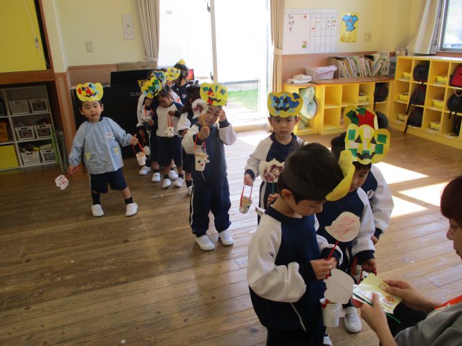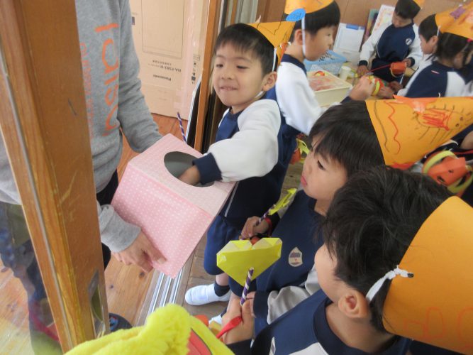 お菓子入れが完成すると、グループに分かれガチャガチャくじを引きます。くじに書かれたトリックオアトリートのミッションへスタート!