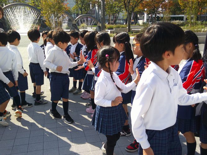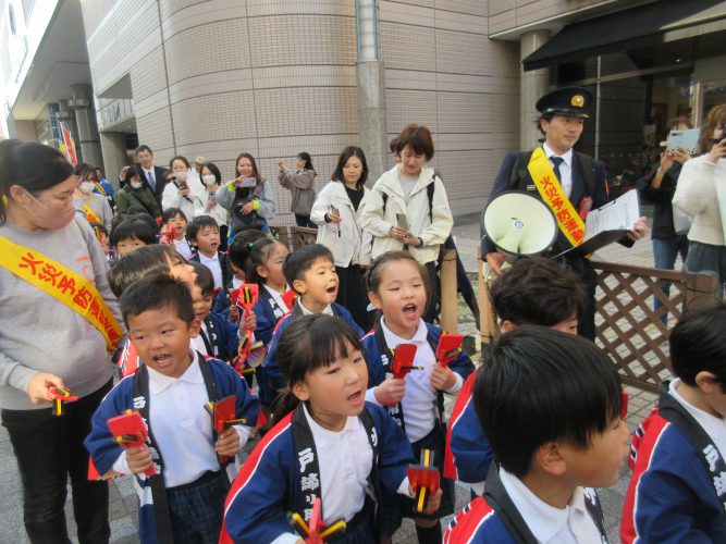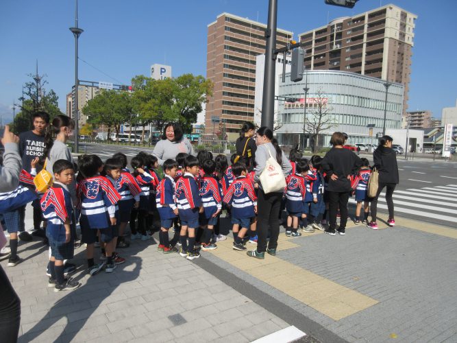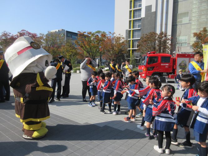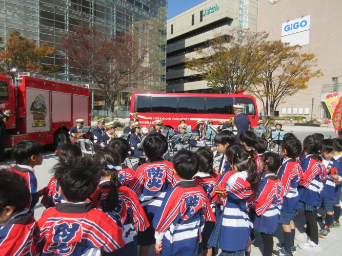 2025年11月7日 お知らせらいおん組さんが街頭での防火パレードに参加しました。園バス🚌でたいすい中央こども園に到着し、一緒にパレードに参加する同じ年長組のお友だちとの顔合わせと掛け声の合同練習をしました。ちょっぴり緊張気味でしたが、練習を終え、会場に出発!車通りの多い道や信号🚥も気をつけて渡り、市民公園に到着すると消防車や音楽隊もいてワクワクするこどもたち。