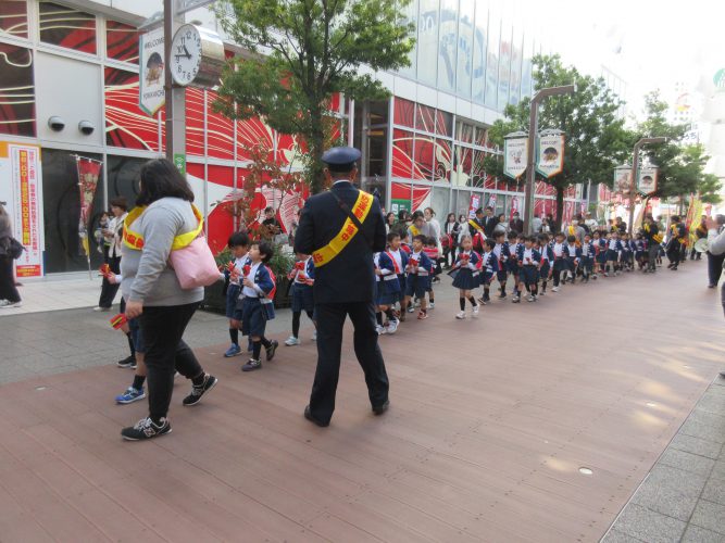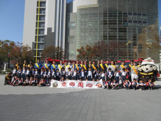 開会の式典に参加し、防火パレードに出発しました!『火の用心!マッチ一本火事の元!!』の合言葉と共に、鳴子を鳴らし、街のみなさんに防火広報活動をさせていただきました。