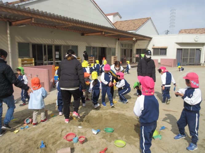 園庭で遊んでいると知らない人が入ってきて、子どもたちのそばに寄っていったり声を掛けている人を発見!子どもたちは先生の誘導を聞いてスムーズに室内へ避難していました。
