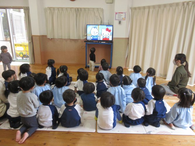 2026年4月23日 お知らせ今日は避難訓練を行いました。年度初めの4月ということもあり、ホールに集まり『命の大切さ』や『非常用ベルの音』をみんなで聞いた後、各クラス順番に地震についてのDVDを観ました。