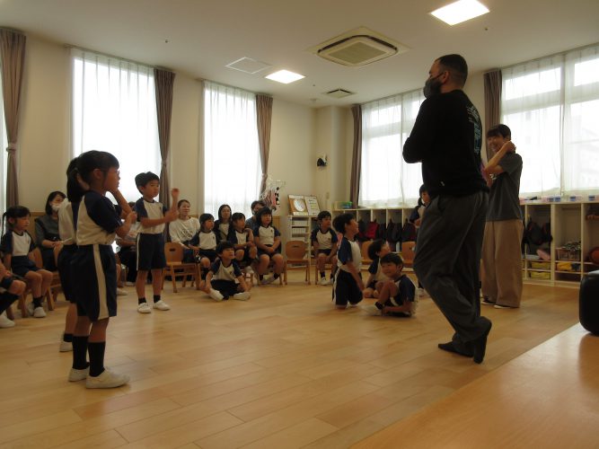らいおん組🦁は、実験遊び、英語教室、リトミック教室をしました。英語教室では、体を使ってカイル先生が言う体の部位と一緒にならないようにするリズム遊びでした。子どもたちはよ~く聞いてカイル先生と一緒にならないように真剣!!最後まで残った子がいましたよ✨