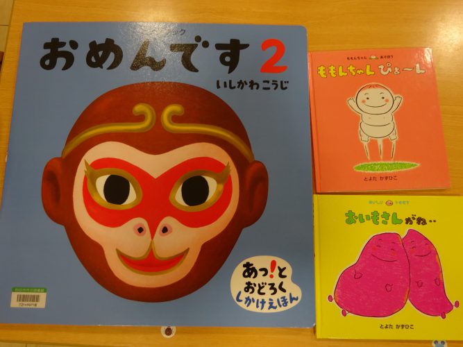 今月は、絵本『ももんちゃんぴょーん』『おいもさんがね…』『おめんです2』のお話です。