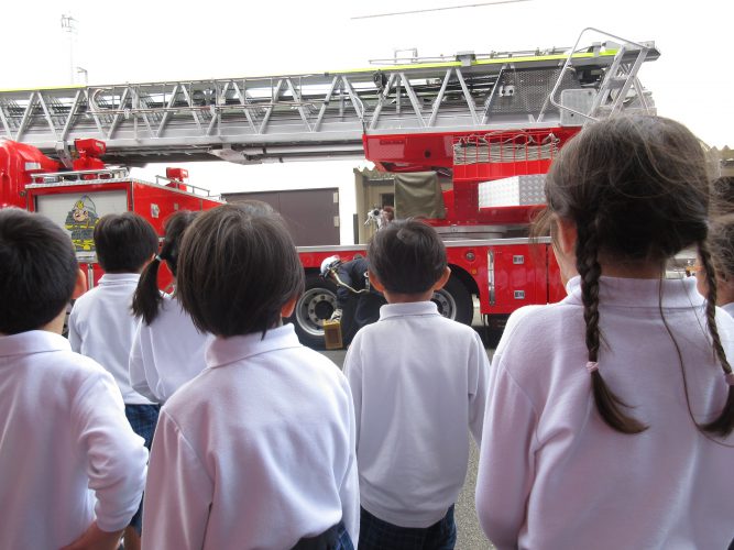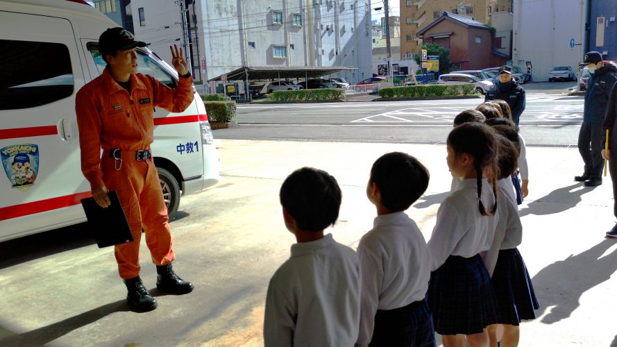 消防署へ着くとたくさんの消防車や救急車があり、嬉しそうな子どもたち。