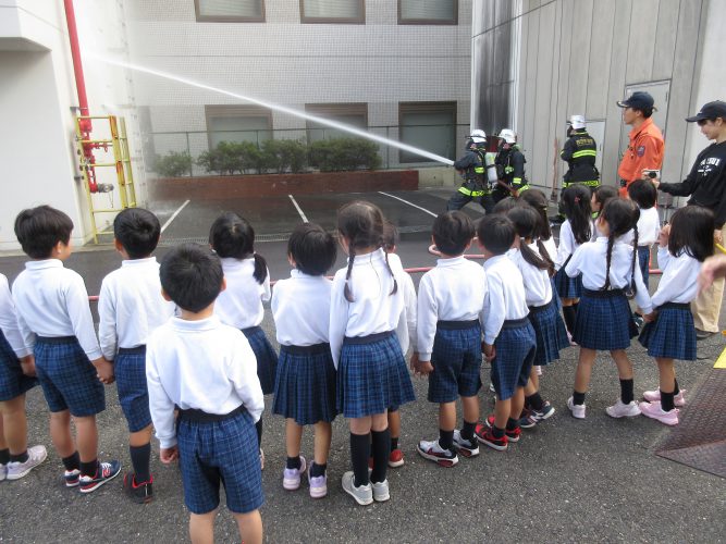 お部屋見学の後は、実際に消防訓練をしている姿を見せてもらいました!