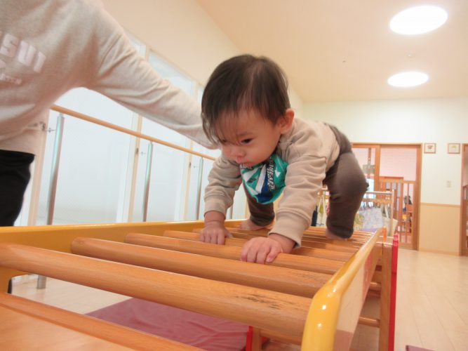 今日の巧技台は足の筋力を鍛えるためにいつもと違い、はしごとはしごの間に隙間を作ったので