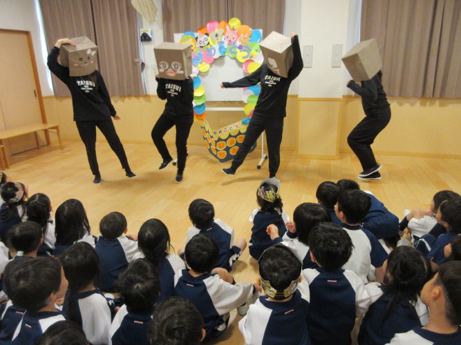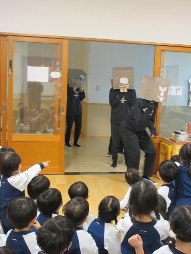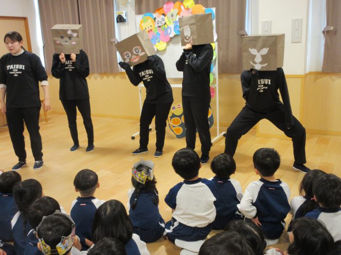 紙袋を被っていることもあり動きがなんだかぎこちない保育者を見て「ネコ?」「キリンじゃない?」と奮闘していた子どもたちでした🤣🤣