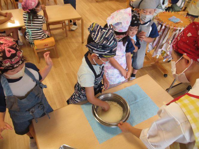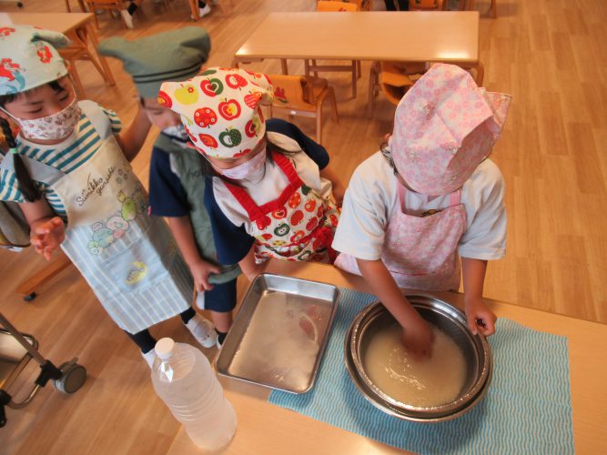 順番にお米を研ぎました。少し緊張した様子で、こぼさないようにそっと混ぜる子が多かったです。「なんだか冷たいね」「お米まだカチカチ」などいろいろな感想が聞こえてきました。中には「お家でいつもやってるよ~」なんていう声も聞こえてきて驚きました(#^^#)