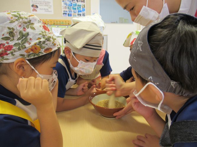 すり鉢でゴマをすりました。「なんだかいい匂いがするね~」とゴマの香りに気が付く子もいましたよ☺