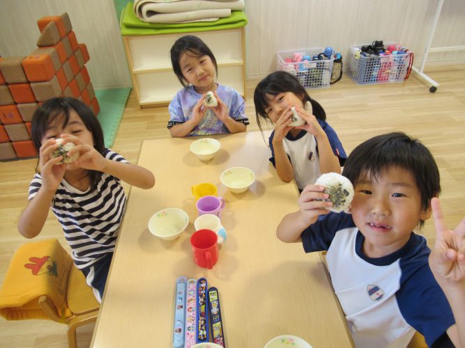 完成したおにぎりはお給食の時間に食べました。自分たちで炊いたお米で作ったおにぎりは、特別美味しくてみんなペロリと完食して、おかわりの行列が!!ふりかけも大人気で、今日はご飯が空っぽになりました(*^-^*)