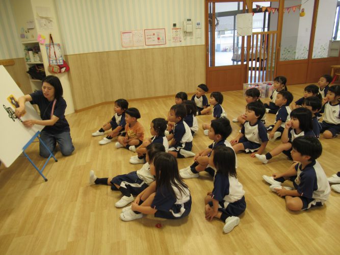 ひよこ組、りす組ではスケッチブックシアター「バースデーバス」を見ました。バスが出発すると次々にこむぎこさん、たまごさんたちが乗ってきてお誕生日の子のお家まで向かいます。ボールに入れて混ぜる所では「ぐるぐる~♪」と子どもたちも混ぜて楽しみました☺
