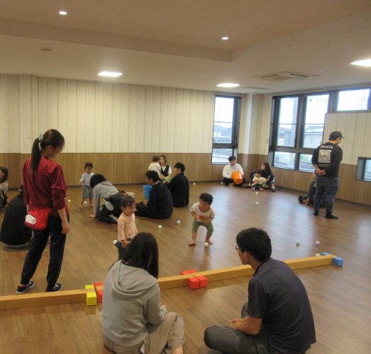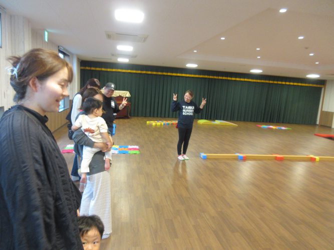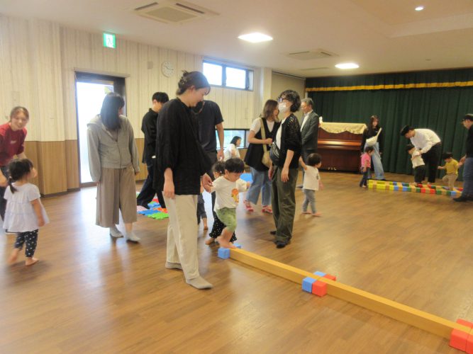 次にサーキット遊びをしました。感覚マットや一本橋、傾斜マットなどをお家の方と手を繋いで進んでいきます。慣れてくると手を離して一人で挑戦する子もいましたよ。今まで繰り返し楽しんできた遊びなので、普段の様子を見ていただけたと思います✨