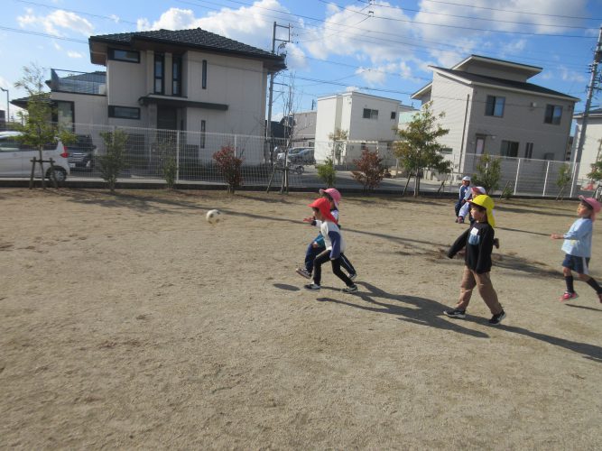 自由遊びでは総合遊具やサッカー、三輪車、長縄とびなど好きな遊びを楽しみました。今日会ったばかりの子どもたちでしたが、あっという間にお友だちになり「入れて~」「いいよ~」と一緒に遊んでいました(#^^#)